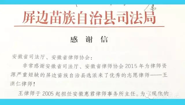日前,云南屏边苗族自治县向省厅、省律协发来感谢信,对我省“1+1”法律援助志愿律师在该县积极开展法律援助、服务基层群众、维护弱势群体权益、帮助培养法律服务人才等方面作出的积极贡献给予高度评价。
